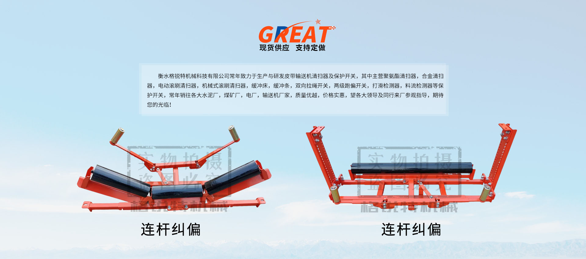 衡水格銳特機(jī)械科技有限公司常年致力于生產(chǎn)與研發(fā)皮帶輸送機(jī)清掃器及保護(hù)開關(guān),其中主營聚氨酯清掃器,合金清掃器,電動(dòng)滾刷清掃器,機(jī)械式滾刷清掃器,緩沖床,緩沖條,雙向拉繩開關(guān),兩級(jí)跑偏開關(guān),打滑檢測器,料流檢測器等保護(hù)開關(guān),常年銷往各大水泥廠,煤礦廠,電廠,輸送機(jī)廠家,質(zhì)量優(yōu)越,價(jià)格實(shí)惠,望各大領(lǐng)導(dǎo)及同行來廠參觀指導(dǎo),期待您的光臨!!!
